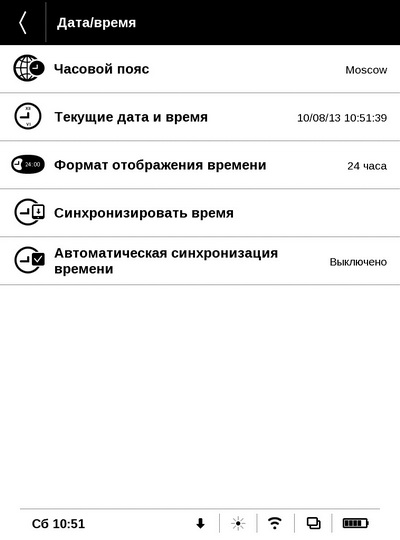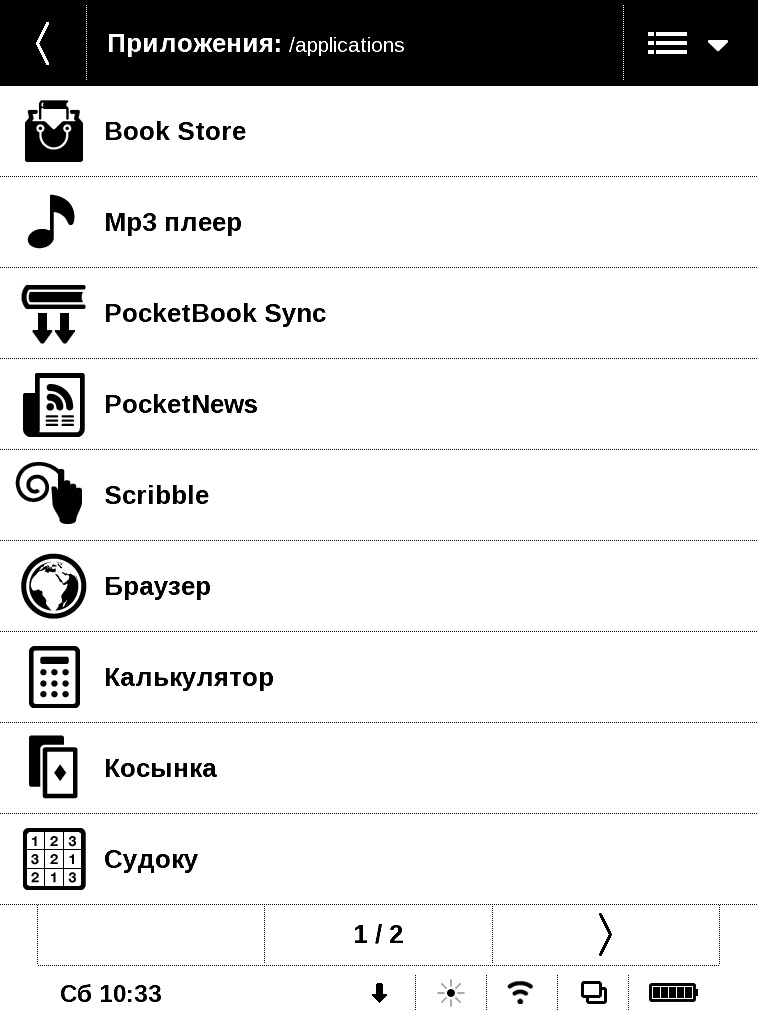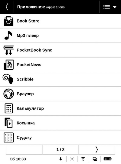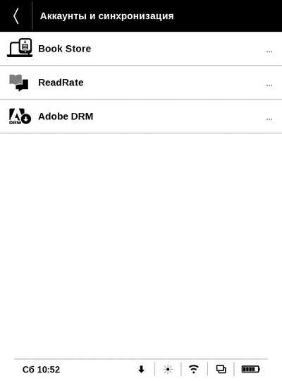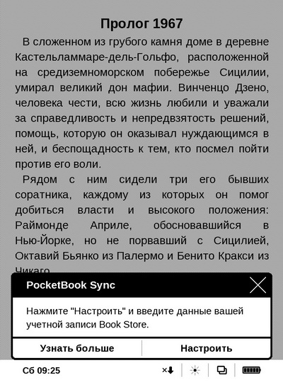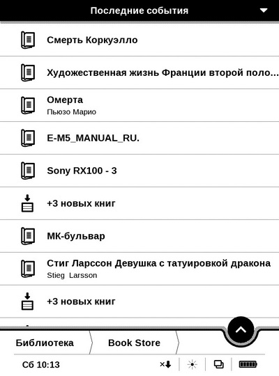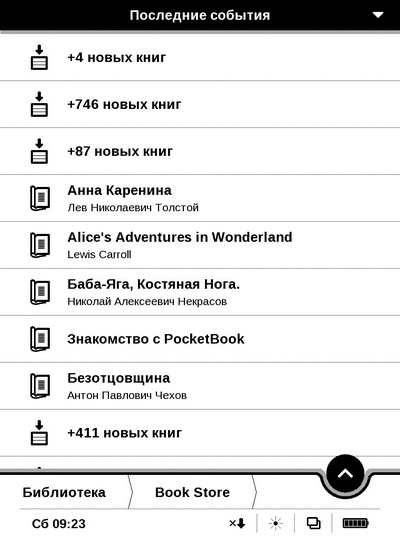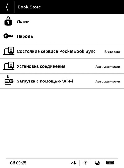 Самая левая пиктограмма в строке состояния вызывает сервис PocketBook Sync - это сетевой магазин для покупки книг, при этом информация обо всех ваших покупках хранится, и вы можете их загружать на любые ридеры, поддерживающие данный сервис.