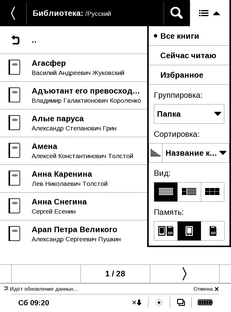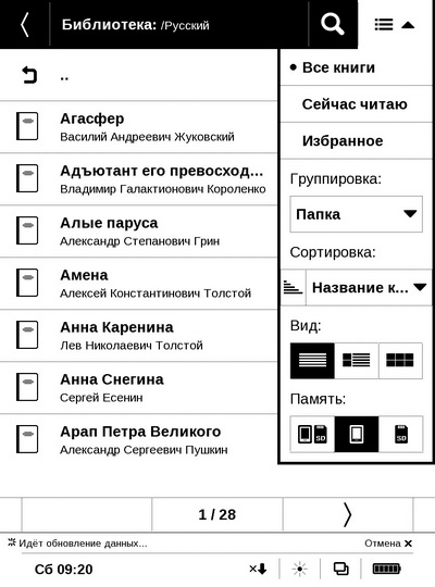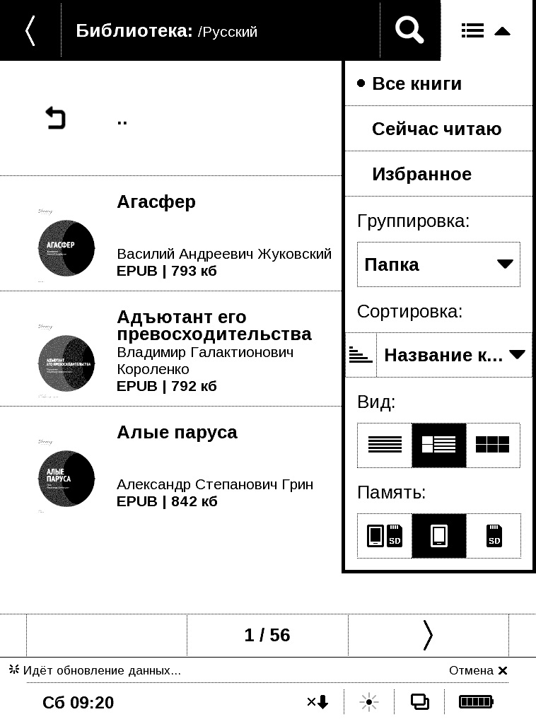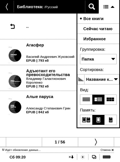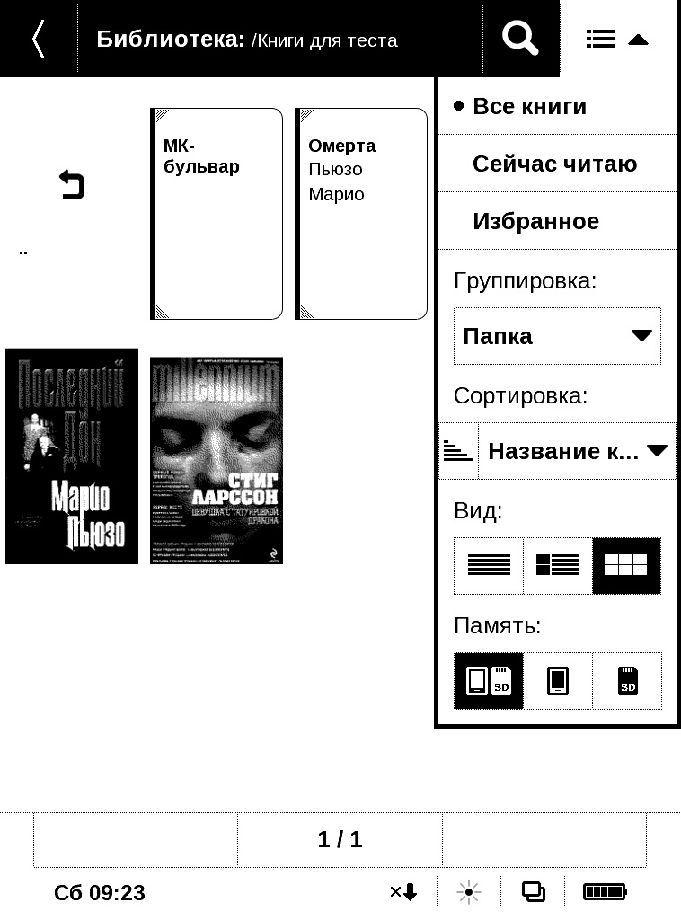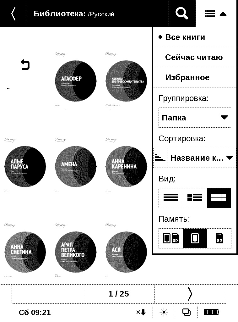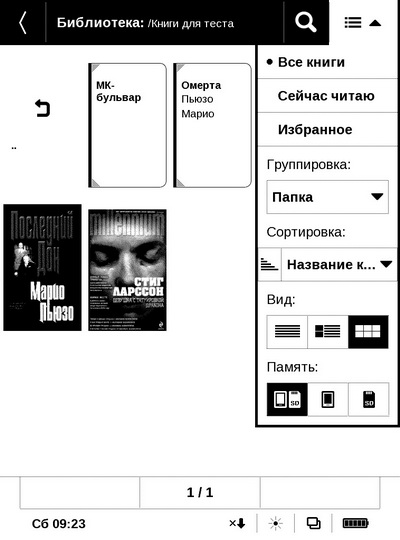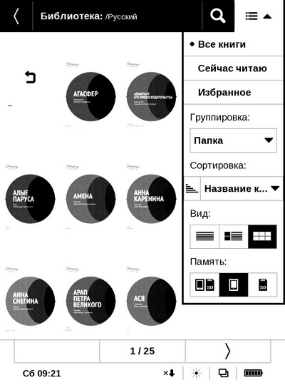 Заходим в библиотеку. По умолчанию там демонстрируются папки со списком книг. Справа идет панель сортировки, группировки, фильтров, формы представления и вида накопителя - ридер и карта, только ридер, только карта.