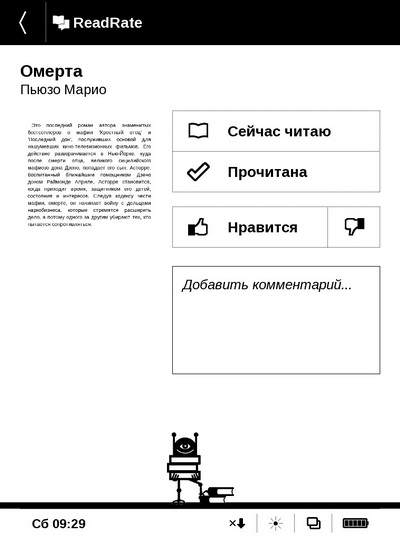 Пиктограмма в центре страницы справа - вызов сервиса ReadRate, с помощью которого вы можете оценивать читаемые книги и давать по ним свои комментарии. Кроме того, этот сервис позволяет вам следить за тем, что читают ваши друзья и как они оценивают читаемые книги.