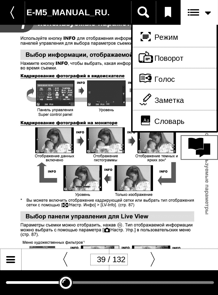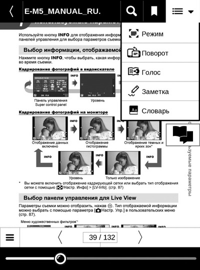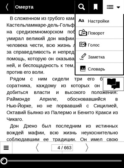 Верхнее меню: настройки, поворот экрана, озвучивание текста, создание заметок и словарь.