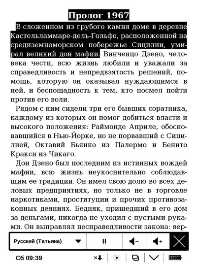 Вызываем из верхнего меню озвучивание текста (например, для прослушивания в машине). Динамика у ридера нет, так что слушать придется через наушники или через подключения к порту AUX автомобиля (для этого потребуется специальный кабель с двумя мини-джеками).