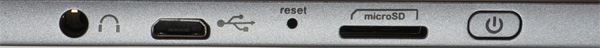 Все выходы и кнопки расположены на нижнем торце: выход для наушников, порт microUSB, reset, слот microSD, кнопка питания. Расположение кнопки питания - явно неудобное, да и нажимается она тяжеловато. В прошлой модели было все то же самое, так и не исправили.