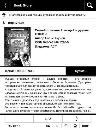 Если перед вами не стоит задача купить ридер как можно дешевле, а вы хотите получить качественный и удобный ридер, с которым не будет никаких проблем с книгами различных форматов и с полноценной поддержкой кириллицы (у ридеров других известных брендов с этим есть немало проблем, особенно у Sony и Amazon) - данная модель, на мой взгляд, является вполне достойным выбором.