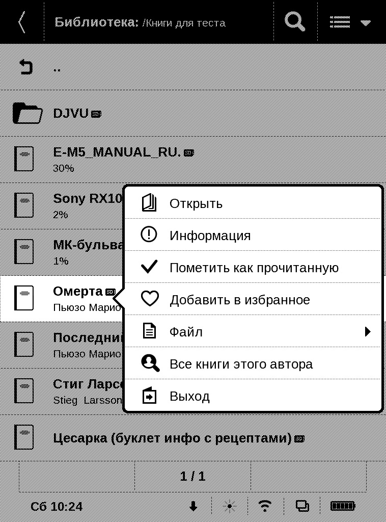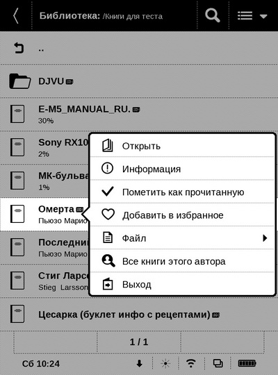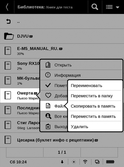 При длинном касании на конкретной книге появляется интерактивное меню.
