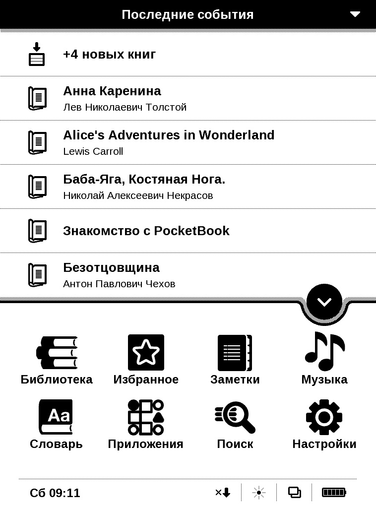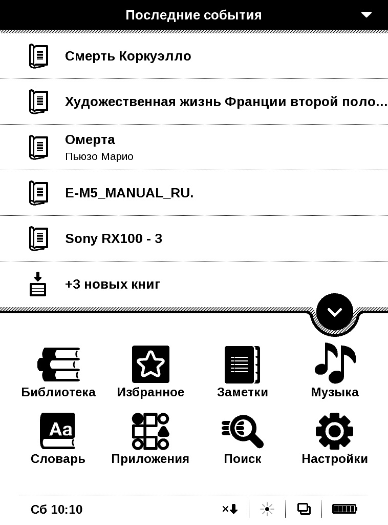Стандартный вид основного десктопа. (Далее все скриншоты - кликабельны.) Сверху идет список книг, включая новые и читаемые в настоящий момент книги, ниже - панель с восемью пиктограммами, в самом низу - строка состояния.