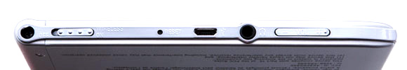 На верхнем торце - слайдер включения-выключения, слот для SIM-карты, слоты для карт памяти, микрофон.