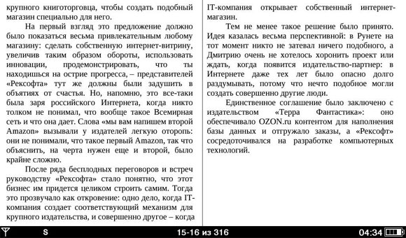 В этой модели, в отличие от PRS-350 и PRS-650, есть двухстраничный режим. Вообще он удобен - в развороте книжка выглядит почти как обычный покетбук, разве что чуть короче по высоте, и в этом варианте очень любят читать многие пользователи. Правда, когда я в этом режиме тестировал книги в формате LRF, там почему-то получались очень маленькие поля между страницами, смотрелось плохо. Однако в формате EPUB поля были совершенно нормальные, читать было комфортно.