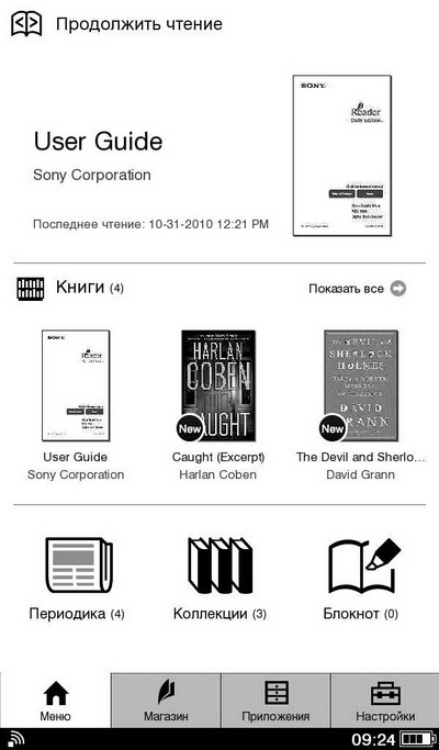 Внизу экрана можно переключаться на три другие закладки - магазин, приложения и установки. Кстати, магазина нет ни в модели PRS-350, ни в модели PRS-650, но оно и неудивительно - эти модели не поддерживают сеть.
