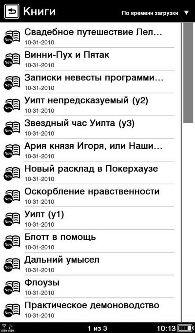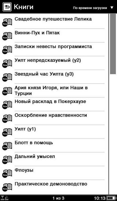 Там интереснее всего режим отображения книг. По умолчанию выводятся обложки. Вы можете также задать режим списка и только название. Второй режим отличается от первого тем, что там не указывается дата файла и название может выводиться в две строки.