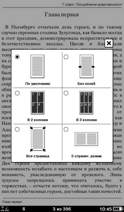 Это, собственно, тоже настройки масштабирования: уложить страницу в размер экрана, уложить в размер по горизонтали, разместить страницу на четыре или шесть экранов. Для обычного текста это совершенно неактуально, а вот для PDF вполне может пригодиться. Если включается двух- или трехколоночный сплит, то навигационные стрелки не появляются, а по частям страницы перемещение идет слева направо сверху вниз кнопками или жестами листания.