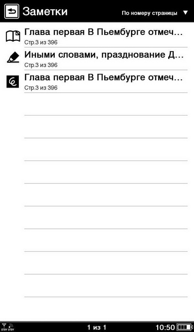 Если не включен режим невидимости заметок, то при чтении они видны на экране. В списке заметок можно посмотреть номера страниц и узнать тип: выделение маркером или рукописная надпись.