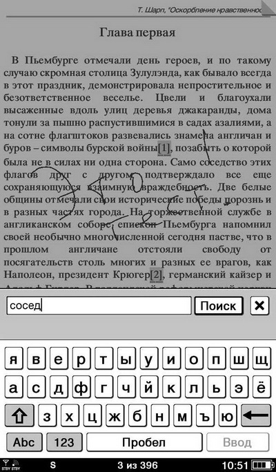 Разумеется, словарь можно вызывать и из читаемого текста. Достаточно выделить слово (щелкнуть по нему пальцем) - словарь появляется автоматически.