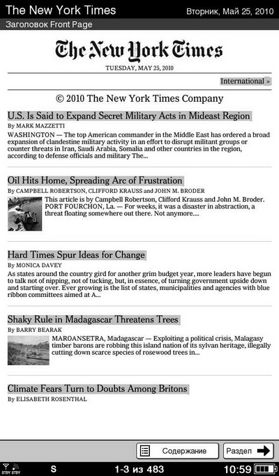 В основной закладке есть отдельная ссылка на периодику, которая закачивается через магазин. В базовой поставке в ридер закачаны четыре издания - The New York Times, The Financial Times, Wall Street Journal и Foreign Affairs.