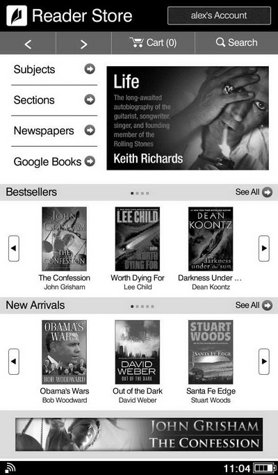 При подключенной сети можно нажать на закладку "Магазин" и попасть в онлайновый магазин Sony под названием Reader Store, где продаются книги и периодические издания. Зарегистрироваться на сайте магазина можно прямо с ридера.