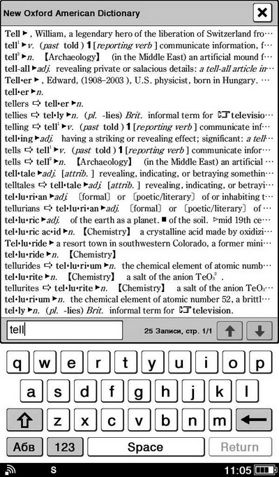 А вот словарь - реально полезное приложение. По умолчанию включен New Oxford American Dictionary. Кроме того, в комплект входят еще 11 словарей - французские, немецкие, испанские, итальянские и голландские. Выбрать нужный словарь можно в настройках устройства. Теоретически тут можно подключать и другие словари, но практически, насколько я понял, это пока ни у кого толком не получилось сделать.