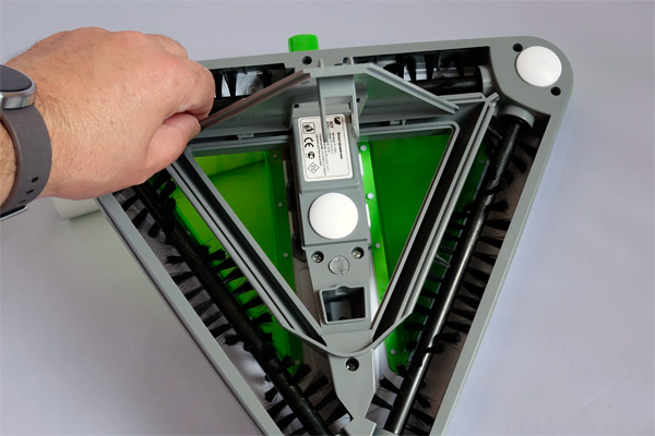 Нижняя поверхность электровеника: три вращающиеся щетки плюс четвертая круглая щетка - для уборки в углах и труднодоступных местах.