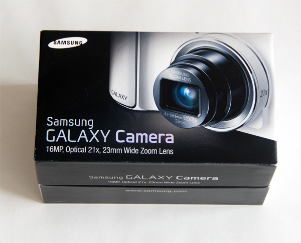 Поставляется камера в коробочке, похожей на смартфонную, но если у нас Galaxy Note II - весь в белом, Galaxy S 4 - весь в деревянном гробике, то Galaxy Camera - вся в черном. Вероятно, в знак траура о несостоявшихся надеждах. Хотя, может быть, это символизирует и что-то другое - I don't know, как говорит самый знаменитый Gun gum style всех времен и народов.