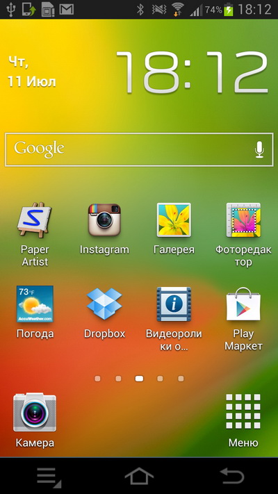 Десктоп. Крайние нижние пиктограммы - камера и меню приложений - выводятся на любых рабочих столах.