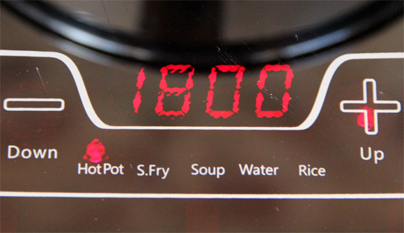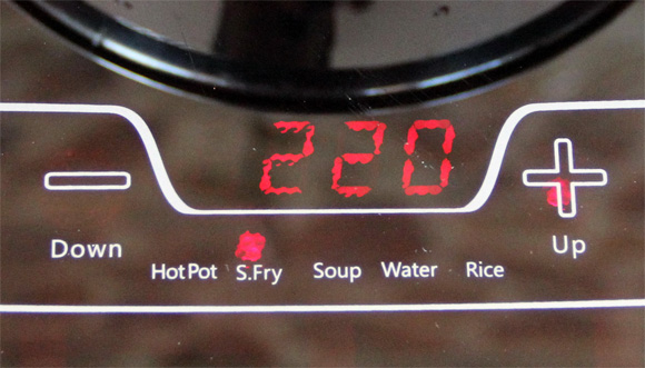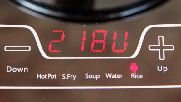 Еще одна интересная особенность - кнопка Elec./Volt. При ее нажатии сначала показывается реальное напряжение в сети (нагрев от него не зависит, но просто может быть интересно узнать), а второе нажатие показывает расход энергии с начала приготовления пищи - например, 0,15 киловатта в час.