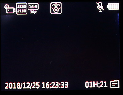 Дисплей в режиме видео. На нем отображаются установленные параметры съемки, дата и время, оставшееся время записи.
