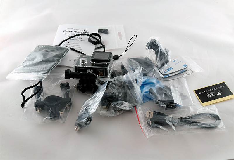 Перечислим: камера, водонепроницаемый чехол, J-образный кронштейн, длинный разъем с винтом, два коротких разъема + винт, крепление на руль велосипеда, адаптер поворота на 360 градусов, два крепления, два клея, одна металлическая кабельная стяжка, четыре пластиковые кабельные стяжки, ткань для чистки, петля-держатель, зажим, чехол для зажима, руководство пользователя на английском и китайском. Ничего себе! И это за восемь тысяч рублей! Для "Сони" за сорок одну тысячу крепления на руль и на торпедо пришлось покупать отдельно. За немаленькие деньги!