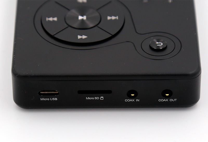 На нижнем торце - порт microUSB, слот для microSD, коаксиальные вход и выход.