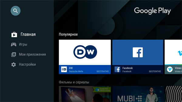 Магазин Google Play выглядит немного по-другому, и в нем показываются только те приложения, которые разработаны для Android TV. В разделе "Главное" - популярные приложения, среди которых в основном всякие сервисы стриминга видео: Vimeo, "Билайн ТВ", "МТС ТВ", "Дождь", "Спорт-онлайн", "НТВ" и так далее. Также есть всевозможные соцсети, сервисы, развлечения, музыка, новости, инструменты и утилиты.