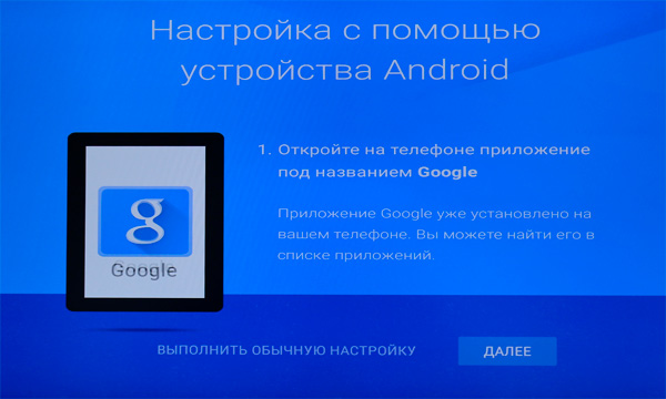При первой установке приставка предложит перенести регистрационные данные из вашего телефона на Android - чтобы не вводить данные аккаунта с экранной клавиатуры.