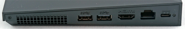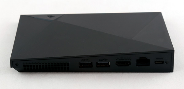На заднем торце размещены следующие порты: два порта USB 3.0 (первый из них может использоваться для доступа к памяти устройства с ПК с помощью кабеля USB-A - USB-A), HDMI, Ethernet, вход адаптера питания.