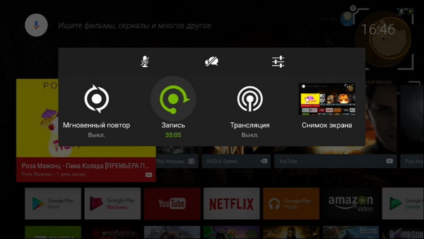 В Android TV установлена защита HDCP, так что напрямую вы не можете записывать стрим-поток прохождения игры на ваш компьютер. На самом деле способы есть - для этого понадобится определенный HDMI-сплиттер, - но в данном случае в этом нет никакой необходимости, потому что средствами самой приставки вы можете как делать скриншоты, так и записывать видеоролики того, что происходит на экране: для этого достаточно нажать и подержать на геймпаде кнопку "Домой" - появится вот такое меню.