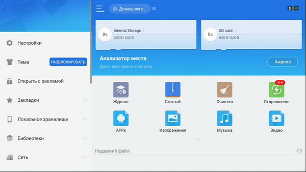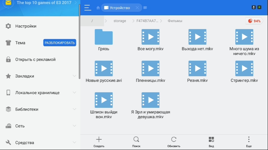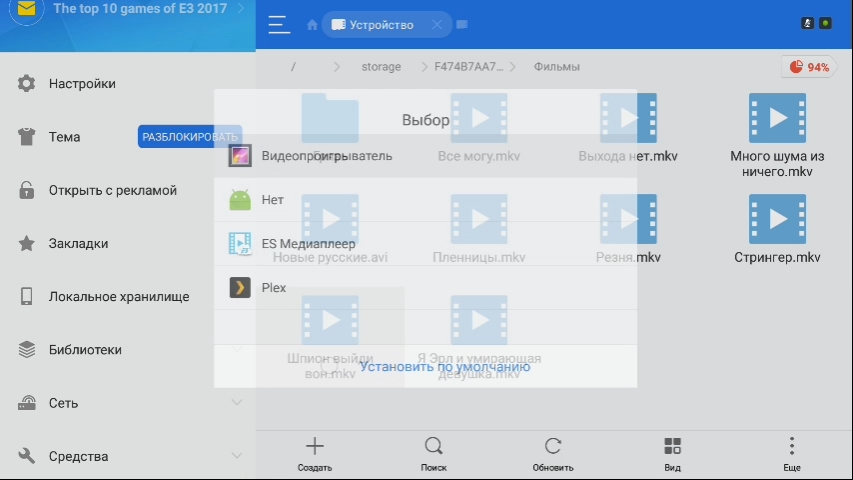 Потестировал, как приставка работает в качестве медиаплеера. По умолчанию здесь не установлено приложение для, например, просмотра медиаконтента с подключенных устройств и сетевых накопителей, но это Android, так что я из "Play Маркет" установил "ES Проводник", а он мне показал и папки сетевого накопителя (NAS), и папки подключенного прямо к приставке внешнего диска.