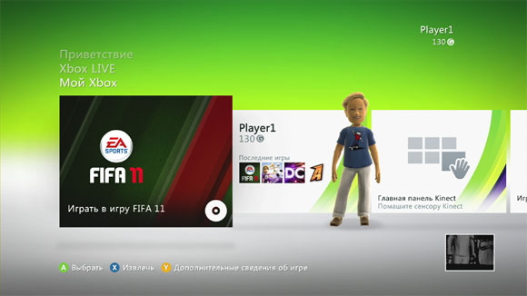 В правом нижнем черно-белом окошке показывается, каким образом Kinect вас отслеживает. Для попадания на главную панель Kinect нужно просто помахать сенсору ручкой.