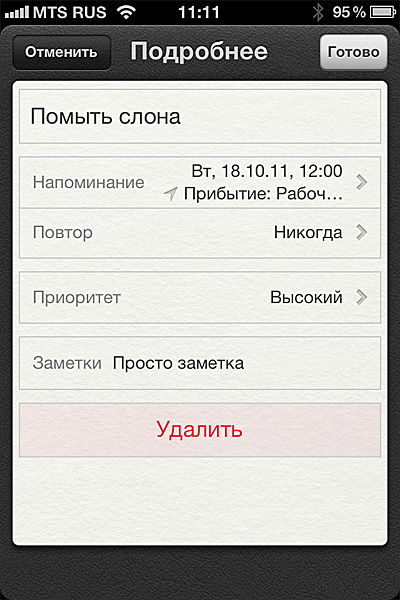 Во-вторых, это не просто список задач. Если нажать на созданное напоминание, появится список опций, в которых можно задать дату и время напоминания о задаче, ввести режим повтора (день, неделя, раз в 2 недели, месяц, год), приоритет, добавить заметку, а главное - можно задать адрес: текущий по GPS или выбрать адрес из книги контактов.