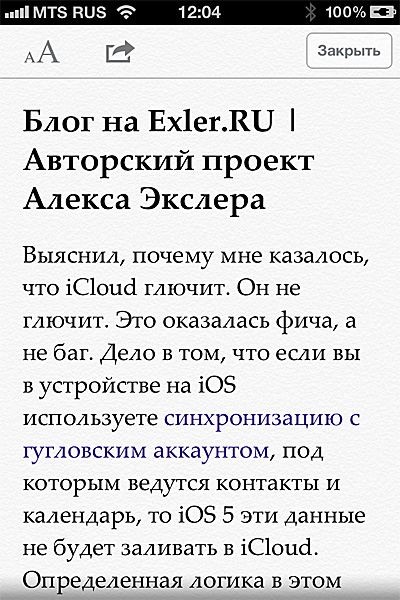 Safari за 2,5 года использования iPhonе 3G у меня вылетал считанное число раз, и только при открытии очень тяжёлых страниц, типа Тёминых фотоотчётов. За 4 дня использования iPhone 4S Safari вылетел уже раз пять. Пару первом использовании приложение "Камера" завесило айфон, пришлось перезагружать. Похоже, Эппл скопировал у Гугла не только экран уведомлений, синхронизацию и апдейты по воздуху, но манеру выпускать неоттестированный софт с кучей мелких багов (увы, знаю не понаслышке - полгода пользовался двумя гуглофонами 😒