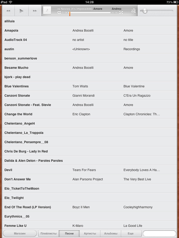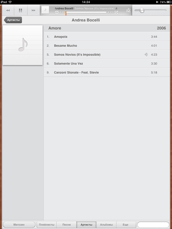 Да вот нихрена не удобный новый плеер в ИПаде - у него почему-то поле вывода названия трэков ограниченно и не меняется от положения экрана. Это приводит к тому, что, например, в Подкастах и Книгах названия просто не помещаются и хрен поймешь что там следующим трэком. Причем в поле название эта программа умудряется впихнуть и автора и альбом и собственно название трэка. Пример. У меня залит архив МДС, который имеет поле Автор - Копп, Альбом - Модель для сборки+Автор книги, Название - Название конкретного произведения. Так вот новый плеер все это пихает в одну строку и прочитать это все невозможно. Приходится ждать когда он наверху бегущей строкой выдаст инфу. И как победить эту заразу - не понимаю