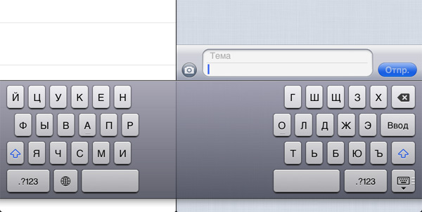 Ну и также для клавиатуры айпэда сделали возможность разделения - чтобы типа как быстро вводить текст большими пальцами. Уж и не знаю, кто это будет использовать, но выглядит забавно.