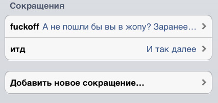Также в настройках добавилась полезная возможность - сокращения. Это чтобы по введенным нескольким символам выдавались заранее заготовленные слова, фразы или целые абзацы.