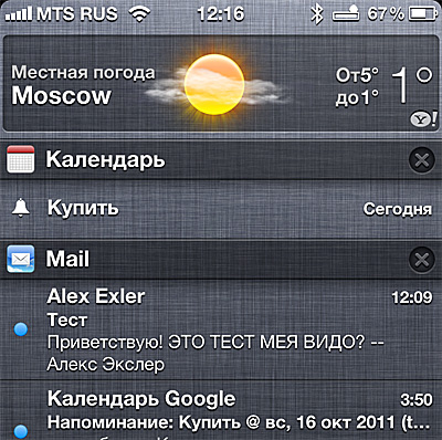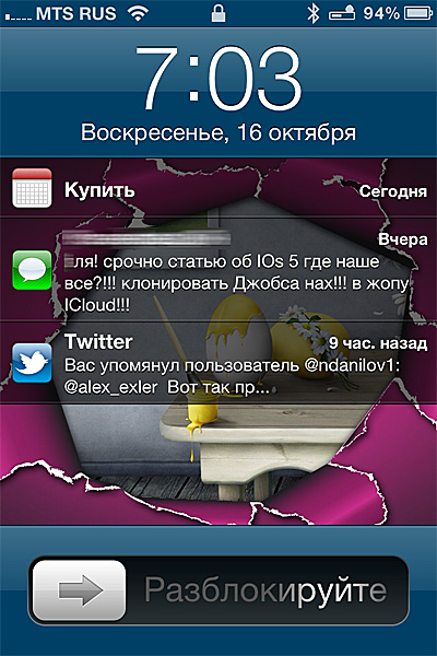 Уведомление на экране блокировки - раньше там были просто сообщения, а теперь они стали значительно более удобными. На экран блокировки теперь можно выводить уведомления от самых разных программ. На каждом таком уведомлении - специальная пиктограмма, которую можно сдвинуть - и попасть в соответствующее приложение. Как и в Android, между прочим, это тоже оттуда взято.
