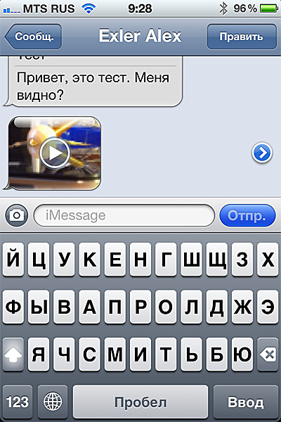 Совершенно новое приложение iMessage, которое очень удачно интегрировано в SMS/MMS. Суть его заключается в том, что если ваш абонент использует гаджет на iOS, то введенное сообщение ему будет отправляться через Сеть, а не как SMS/MMS. При этом к сообщению, разумеется, можно прикладывать фото и видео, а адресоваться к абоненту можно не только по его номеру мобильника, но и по электронной почте - как это сделано в FaceTime.