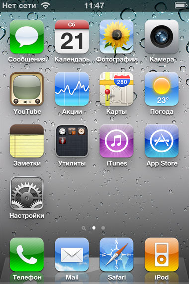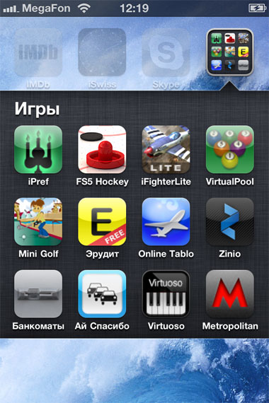 "Утилиты" - это так называемая папка. Нововведение четвертой прошивки. Теперь под одной пиктограммой-папкой может скрываться до двенадцати приложений. Папкам даются названия - точно так же, как и приложениям. Вот так выглядит папка "Утилиты".
