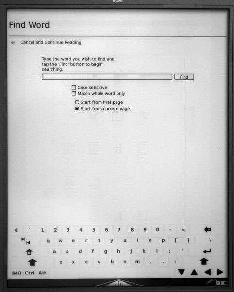 Поиск слова осуществляется как обычно. Вводите с помощью экранной клавиатуры подстроку, отмечаете опции - регистр, совпадение, откуда искать, - после чего устройство ищет первое совпадение, и если найдет, то возникает окошечко поиска по совпадениям вперед и назад по тексту.