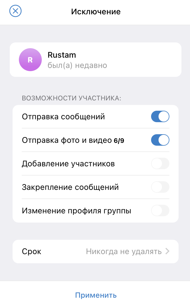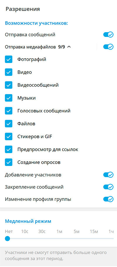 Рекомендуется сразу убрать возможность закрепления сообщений и изменения профиля группы. "Медленный режим" можно включать, если в чат понабегут спам-боты. Впрочем, от них защитит Combot, который мы подключим к чату.