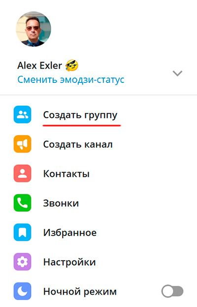 Группа в Телеграме создается очень просто: "меню - создать группу". (Я скриншоты показываю на примере клиента Телеграм для Windows, но в смартфоне - все то же самое, а если есть разница, то я это будет отдельно показывать.)