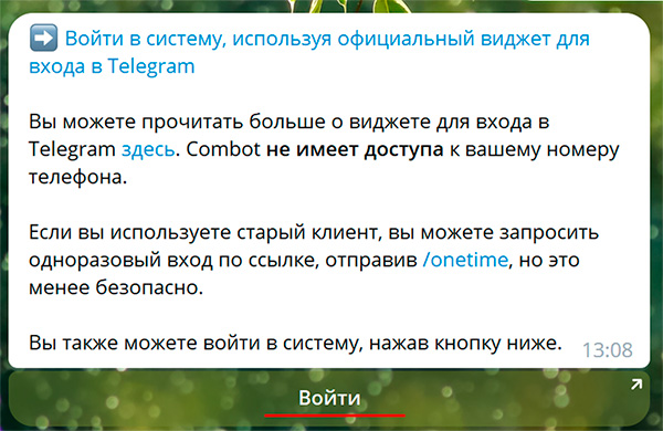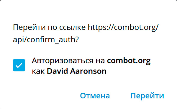 Там снова нажать кнопку "Войти", после чего Combot предложит авторизоваться на сайте сервиса с вашим личным телеграм-аккаунтом, под которым вы запустили бота.
