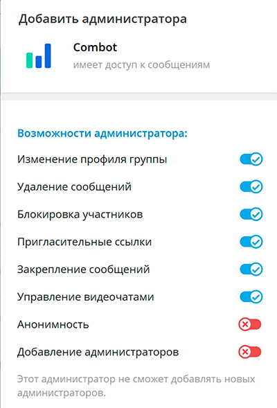 Кнопкой "Добавить" добавляем Combot в администраторы. Появятся вот такие настройки. Менять там ничего не нужно.