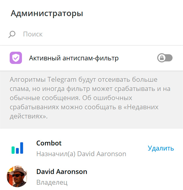Теперь нужно добавить Combot в модераторы вашего чата.