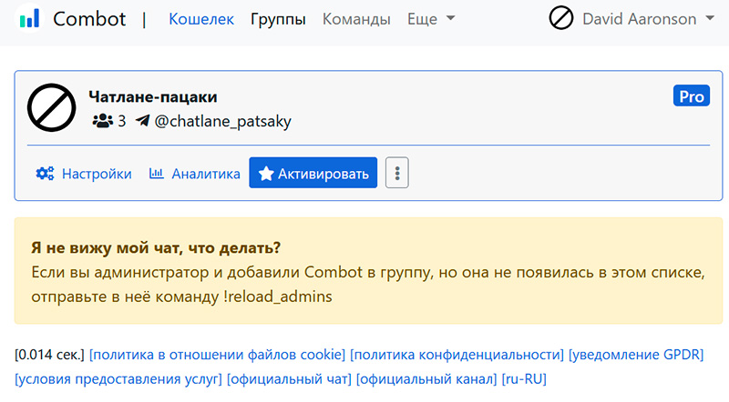 Теперь возвращаемся в браузер в раздел управления группами Combot - там появился наш чат. При подключении чата дается 7 дней бесплатного использования для проверки всех возможностей. Через неделю после начала использования Combot станет требовать оплату.