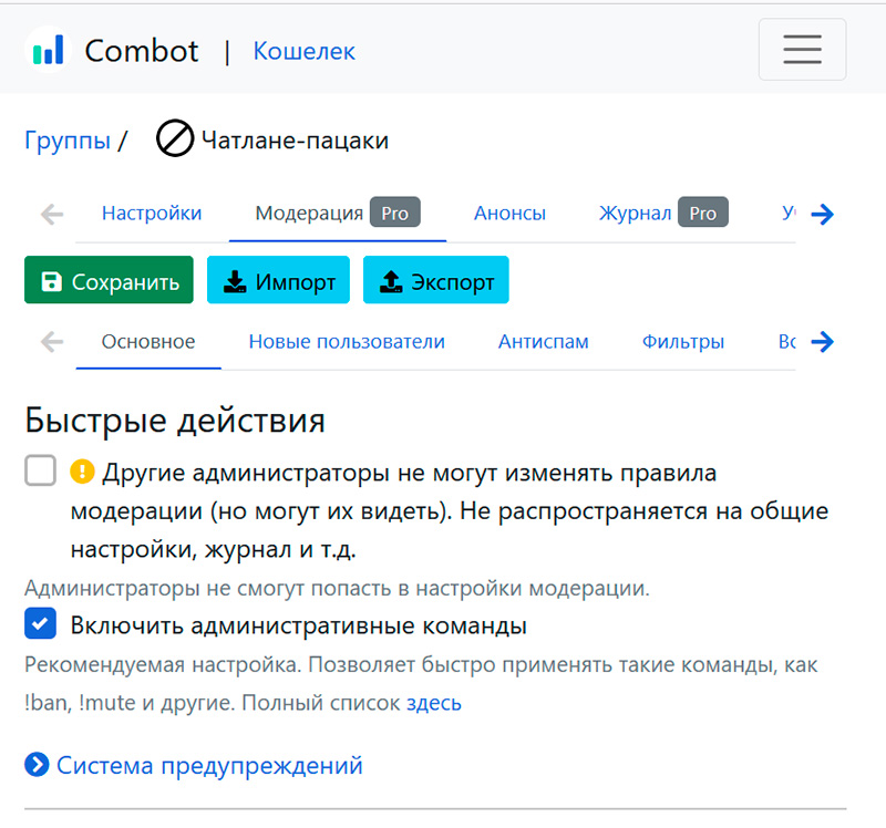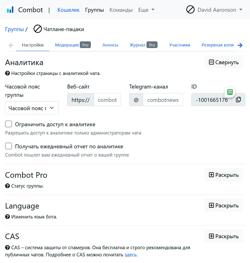 - добавляем Combot в модераторы вашего чата;