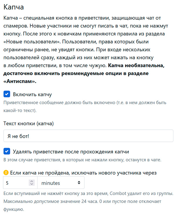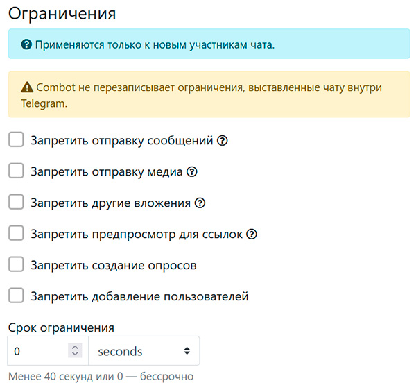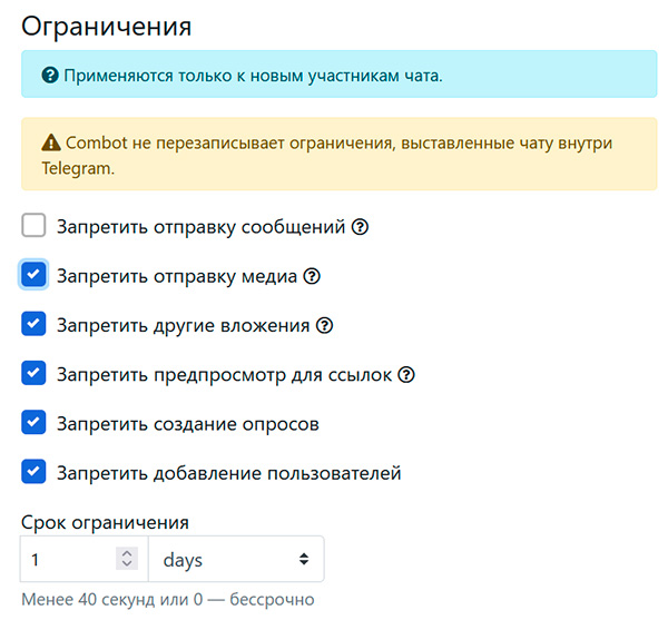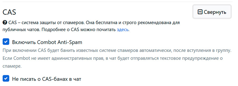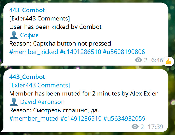 Большинство действий, направленных на защиту вашего чата от спама и ботов, Combot делает автоматически. О наиболее важных его действиях сообщается в отдельном чате, о котором я писал выше.