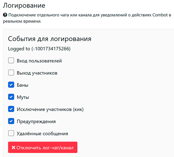 "Логирование" - это сообщение обо всех действиях Combot в специальный отдельный чат.
